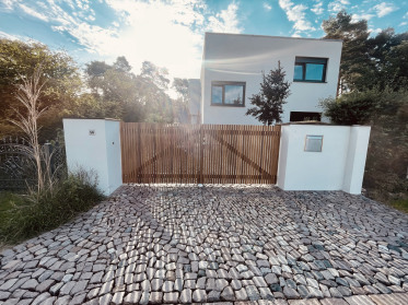 Dieses moderne Einfamilienhaus wurde individuell nach den persönlichen Bedürfnissen der Bewohner entwickelt und optimal an die Gegebenheiten des Grundstücks angepasst. Das zweigeschossige Gebäude beherbergt im Erdgeschoss die zentralen Wohnbereiche: Wohn- und Essbereich sind offen miteinander verbunden, während die Küche bei Bedarf abtrennbar ist. Im Obergeschoss befinden sich die Individualräume, die flexibel genutzt werden können – es besteht die Möglichkeit, die drei ursprünglich getrennten Räume zu einem großen Raum zusammenzuführen. Das Konzept vereint zeitgemäßes Design mit funktionaler Raumaufteilung und schafft ein komfortables, auf die Bewohner zugeschnittenes Zuhause.